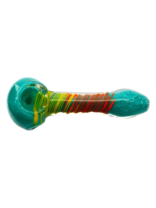 Pipa tipo spoon hecha en borosilicato (Pyrex) de alto espesor, pensada para rotación intensiva con resistencia térmica y sabor neutro. Su formato compacto, con largo real medido de 10,2–10,5 cm, da un tiro directo y controlado gracias al carburador lateral. La cazoleta profunda favorece una combustión pareja de flores secas. Acabado inside-out con núcleo verde aqua y espiral naranja con acento amarillo que luce vibrante y aporta buen agarre.