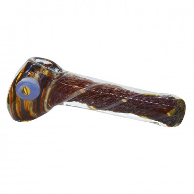 Pipa tipo spoon hecha en borosilicato (Pyrex) de alto espesor, diseñada para rotación intensiva con excelente resistencia térmica y sabor neutro. Su formato compacto, con largo real medido de 12,5 cm aprox., permite un tiro directo mediante carburador lateral, ideal para sesiones rápidas y uso personal. La cazoleta profunda garantiza una combustión uniforme con carga moderada de flores secas. El acabado integra un bowl decorado en ámbar con líneas negras y un punto en relieve azul pastel, mientras que el cuerpo transparente expone una espiral interna densa en tono rojo oscuro que recorre toda la cámara. La boquilla cilíndrica, con cierre redondeado, completa esta pieza de alto impacto visual. Una pipa precisa, resistente y de estética definida, pensada para catálogos de pipas de vidrio y accesorios compactos para hierba seca.