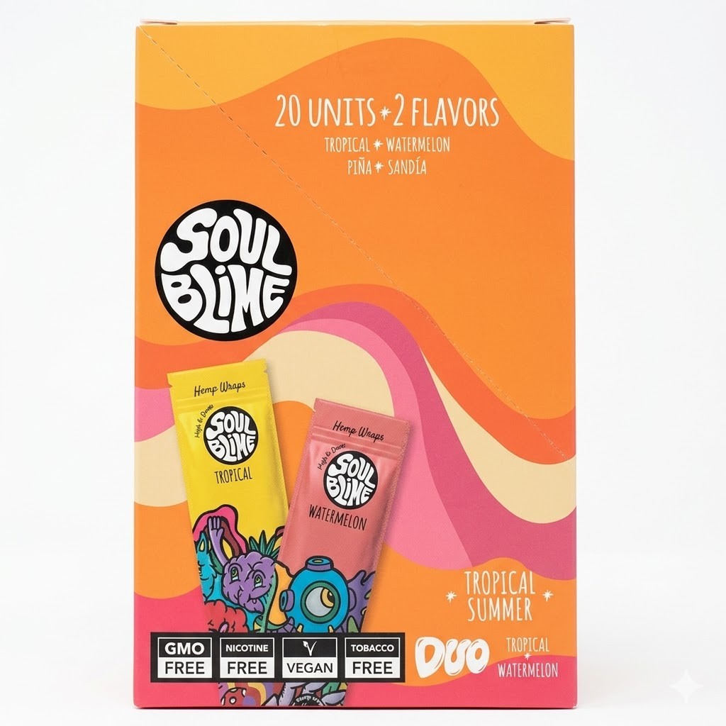 La combinación de piña y sandía entrega variedad en perfiles frutales dentro de una sola presentación, manteniendo consistencia en cantidad y formato. Su caja de 20 unidades permite un manejo ordenado y reposición simple del mismo producto. Duo Tropical Summer reúne wraps de cáñamo saborizados con una propuesta definida: 10 unidades tropical y 10 watermelon en una sola presentación.