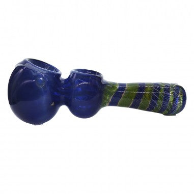 Pipa tipo spoon hecha en borosilicato (Pyrex) de alto espesor, diseñada para rotación intensiva con excelente resistencia térmica y sabor neutro. Su formato estándar, con largo real medido de 14 cm aprox., permite un tiro directo y controlado mediante carburador lateral, ideal para sesiones personales de consumo rápido y eficiente. La doble cazoleta profunda facilita una carga media con combustión uniforme. El acabado presenta bowl azul intenso con detalles en vidrio sólido, cámara central y boquilla decoradas con espirales verdes y azules sobre fondo translúcido, generando un contraste visual vibrante. Además, incorpora apliques verdes superiores que aportan presencia estética. Una pieza equilibrada, resistente y llamativa para catálogos de pipas de vidrio y accesorios para hierbas secas.
